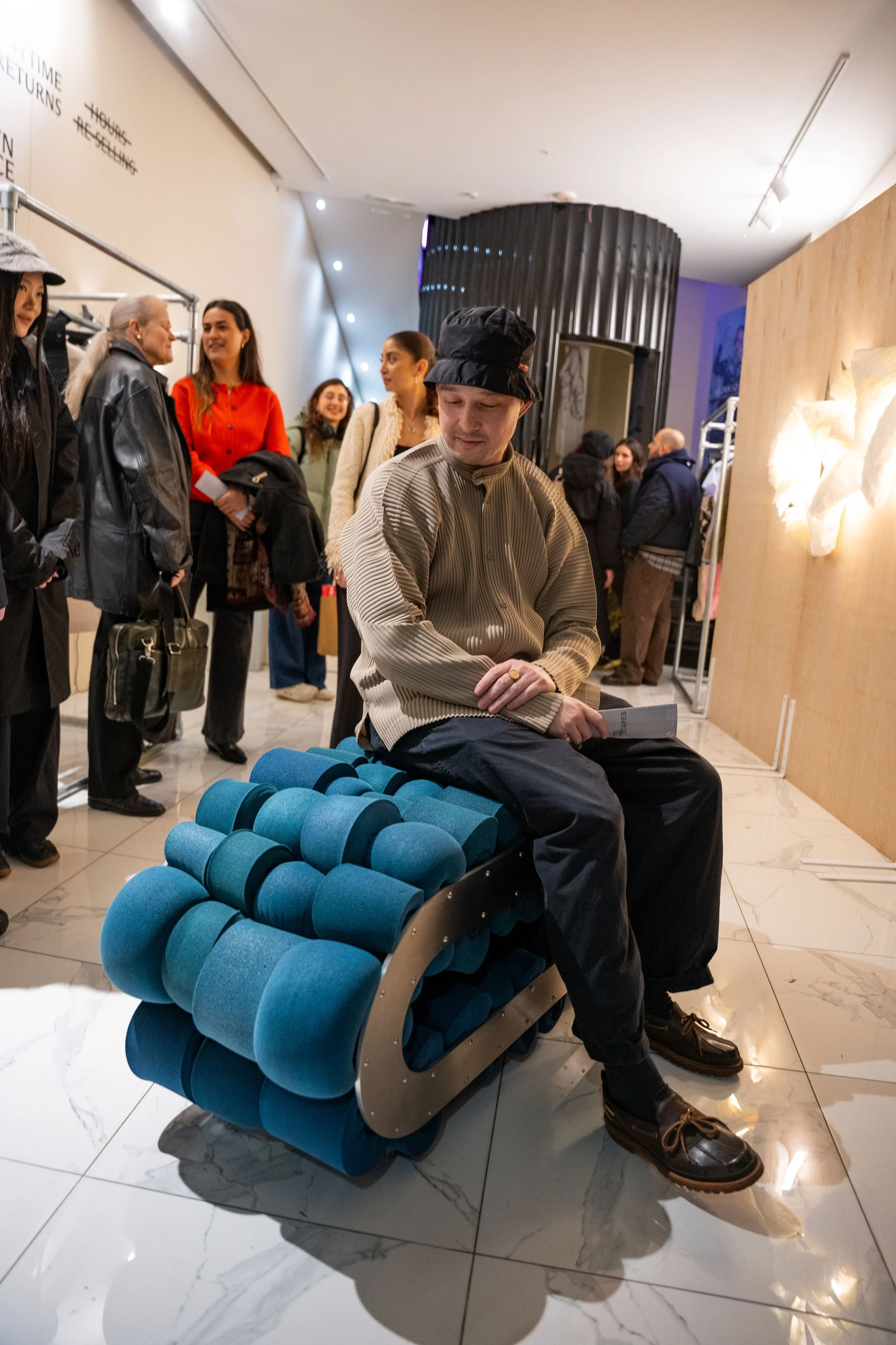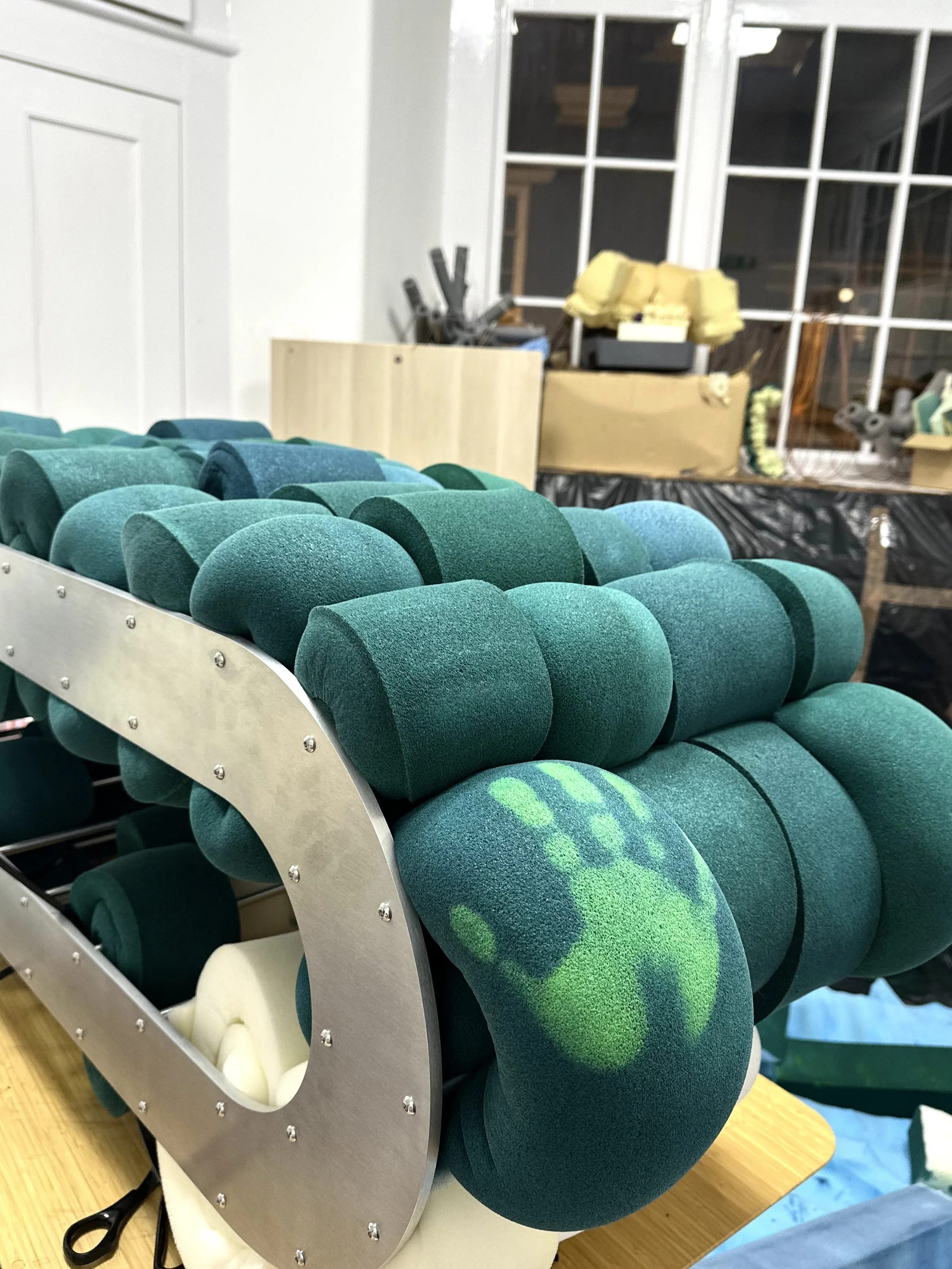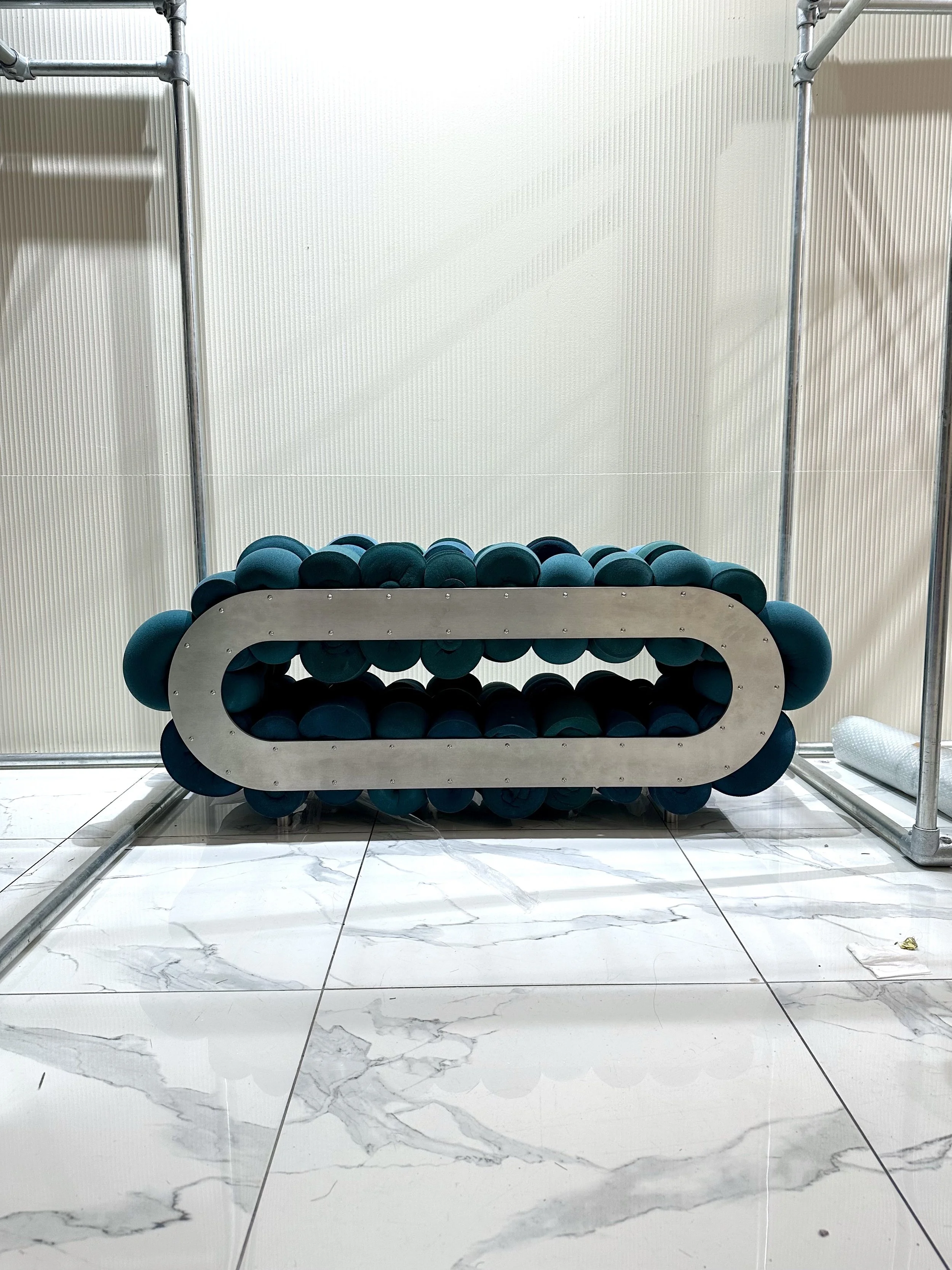 For Hollow Core, Walls shifted his methodology by allowing reclaimed factory waste foam to dictate the formal outcome of the piece, rather than imposing a predetermined structure onto the material. This process-driven approach foregrounds the inherent behaviour, density variations, and irregular geometries of the foam itself. Offset junctions, surface inconsistencies, and structural asymmetries are not concealed but embraced, becoming integral to the character and identity of the work.